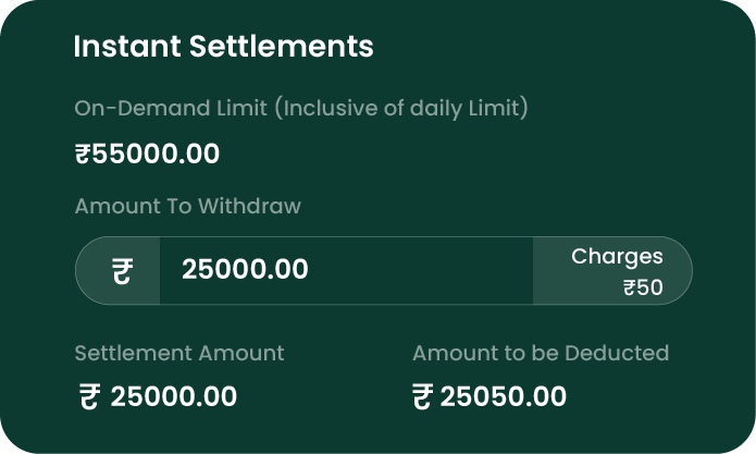 By opting for instant settlements, you can reinvest in your business faster and meet financial obligations promptly. Enjoy the confidence of having your money when you need it